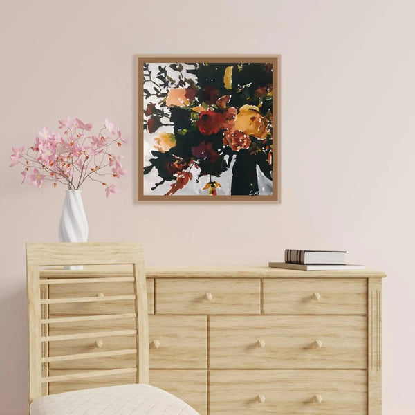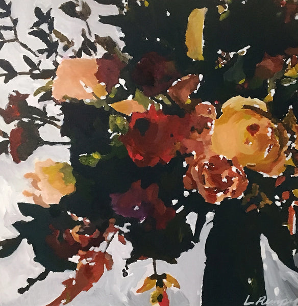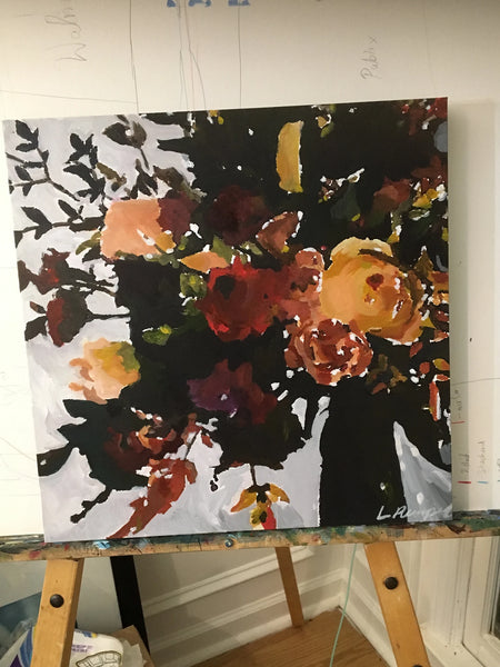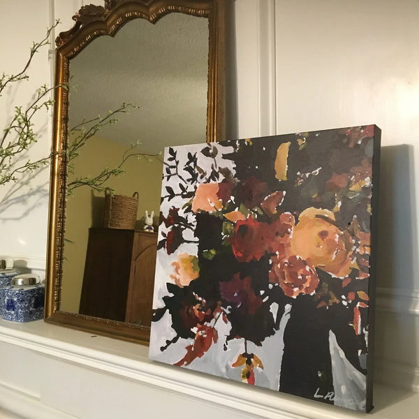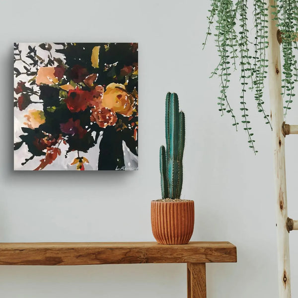 Heart Warming bursts with energy and warmth, featuring vibrant roses and blooms in fiery orange, maroon, and plum. This 16" x 16" original acrylic painting captures the beauty and movement of a freshly gathered bouquet, with rich color layers and expressive brushwork that make the flowers almost dance off the surface.