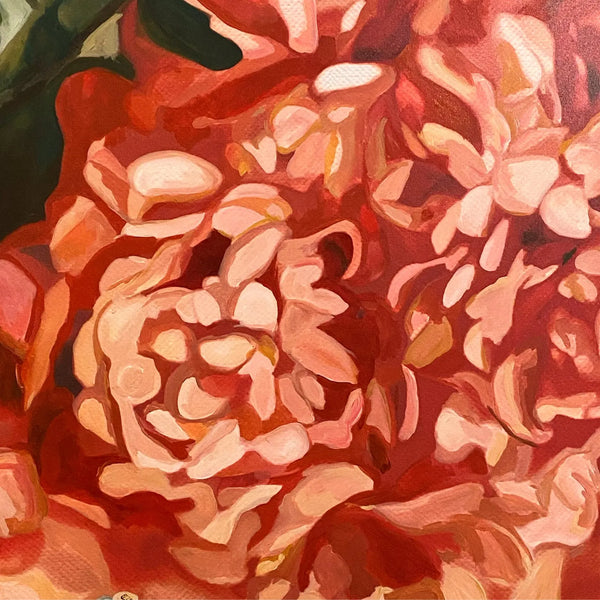Fill your space with warmth and elegance with “Summer Blooms,” an original acrylic painting by Lindsay Rempel. This 30x40 inch canvas bursts with lush dlorals in layered shades of coral, blush, and green, creating a bold and joyful centerpiece. The painterly texture and expressive brushstrokes give this floral artwork a sense of depth and movement that makes it feel alive.